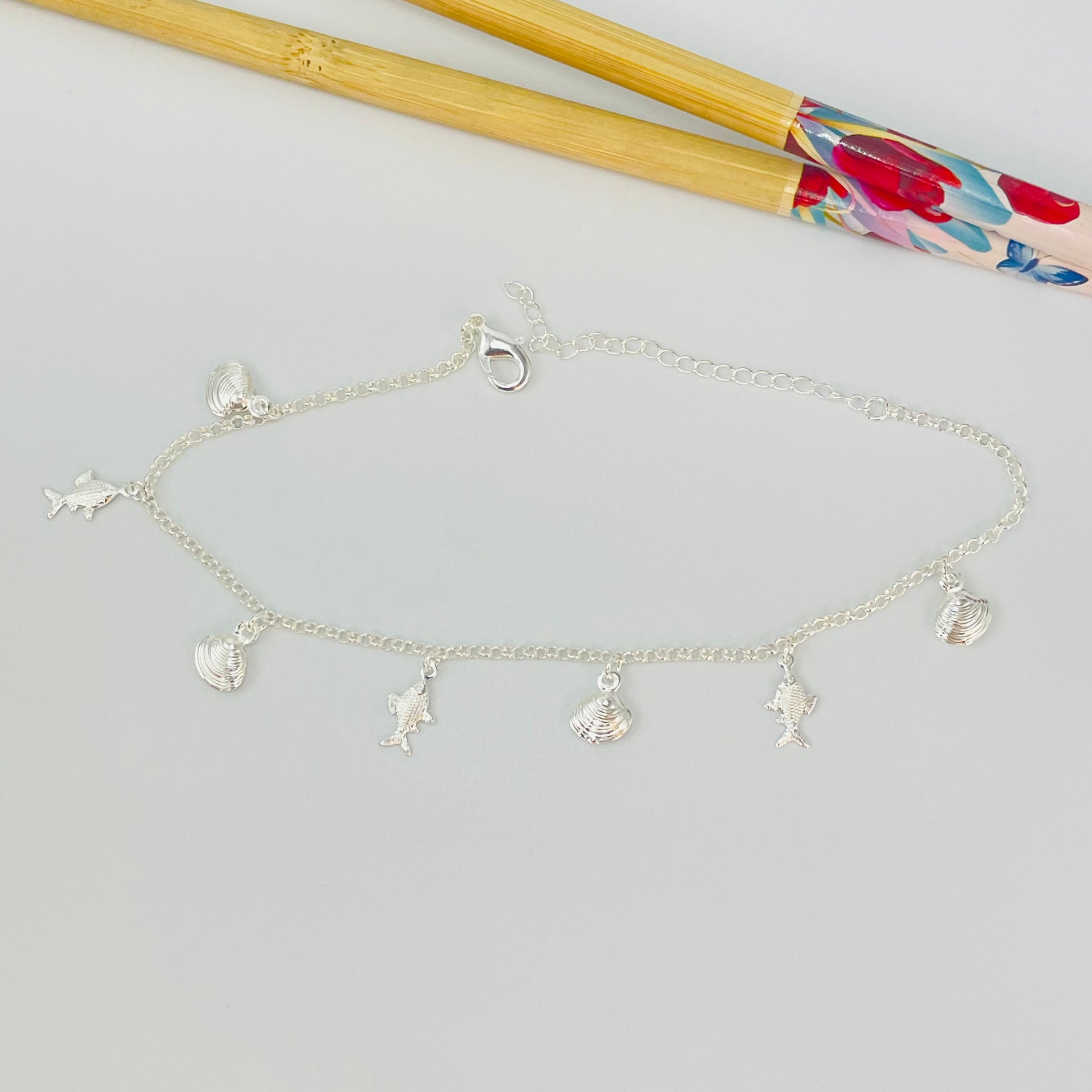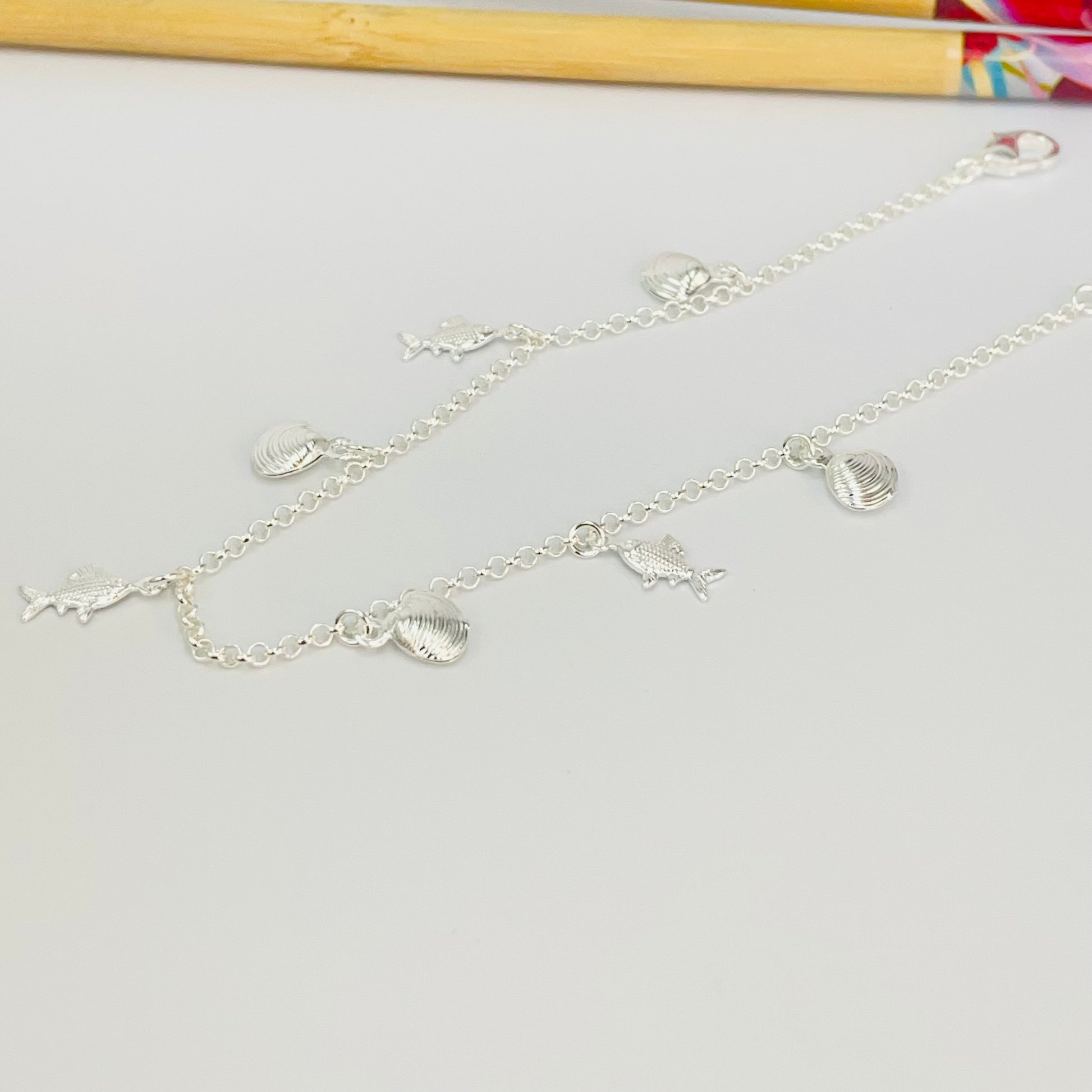 TOBP1001 Tobillera Mar Conchitas y Peces 8 mm Cadena Rolo Eslabon 2 mm Largo 22 cm más Extensor 5 cm Tobillera Baño Plata
