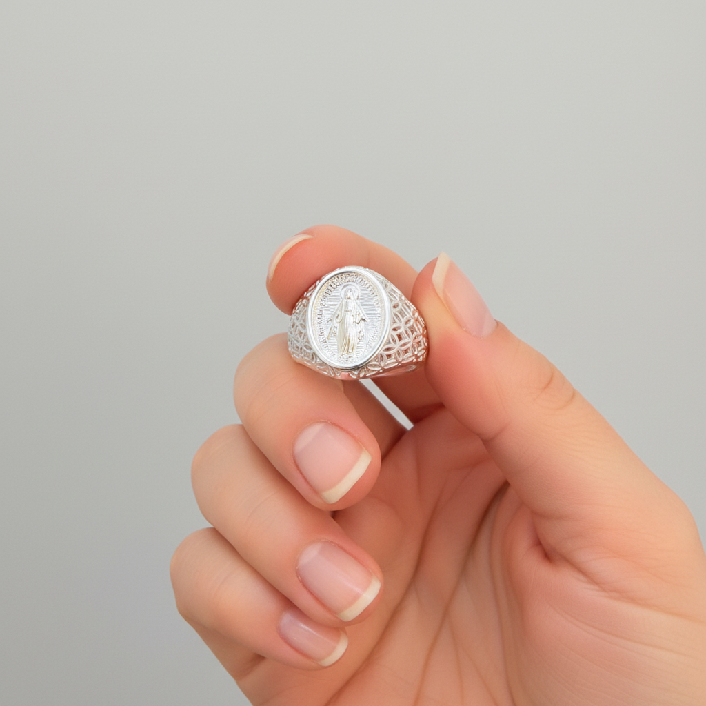 WP80 Anillo Tipo Chevalier Virgen de los Rayos Esfera Ovalada 14 x 11 mm ancho argolla 3 mm Anillo Baño Plata